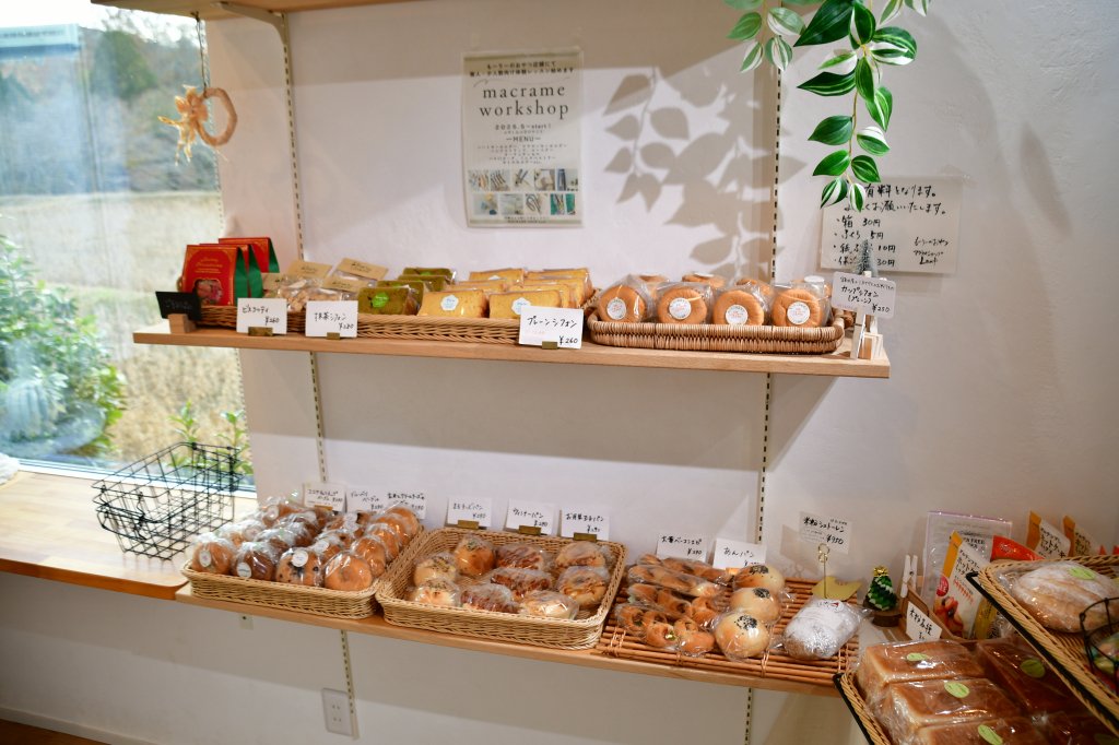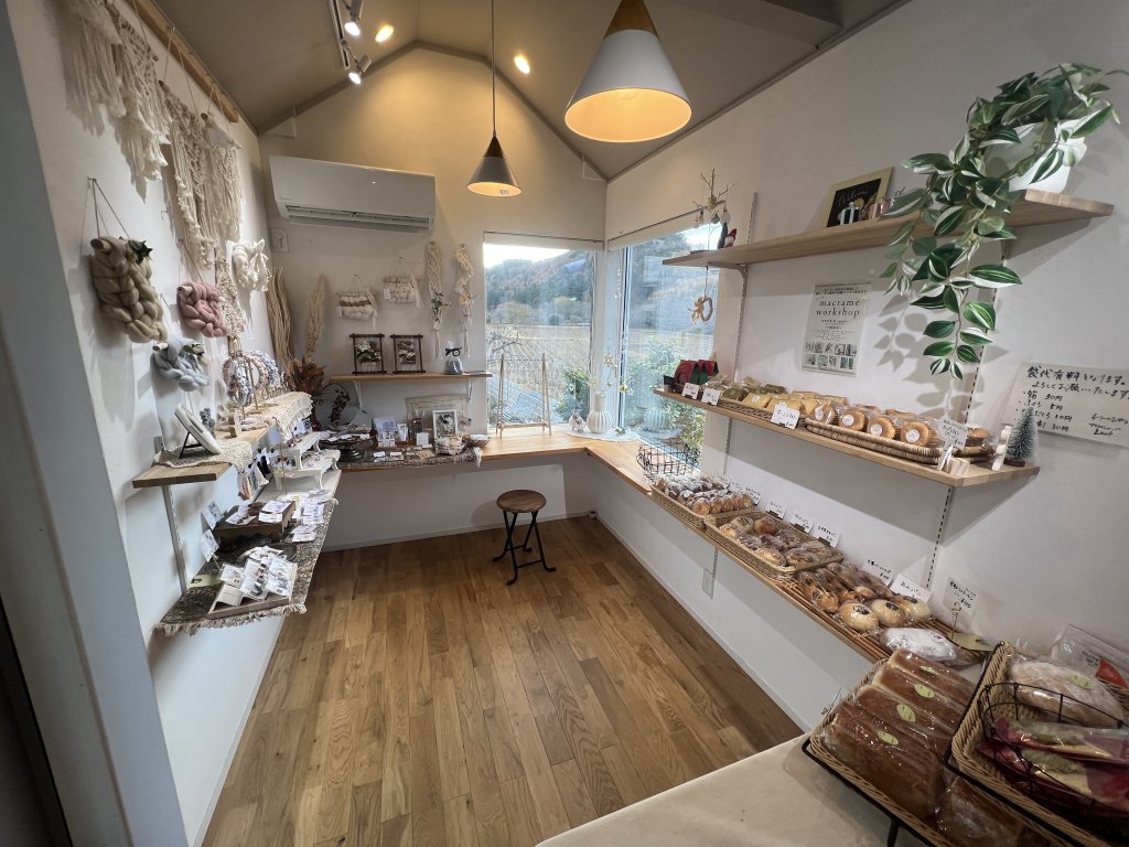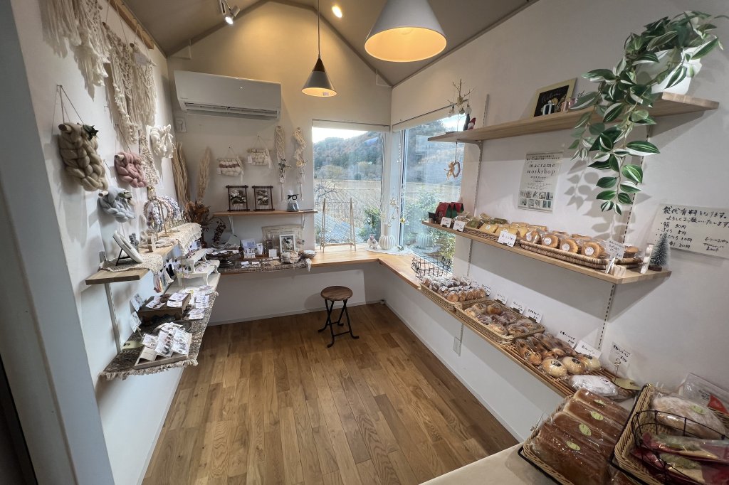 約6畳ほどの店内には、パンや雑貨が並び、自然光が優しく差し込む明るくアットホームな空間が広がります。