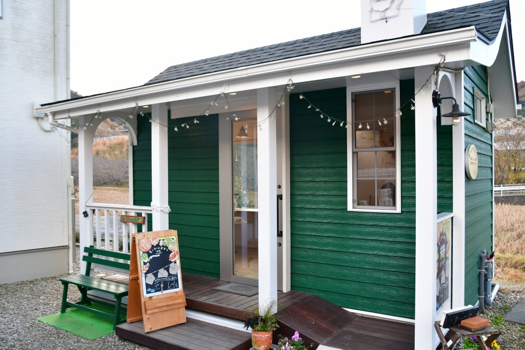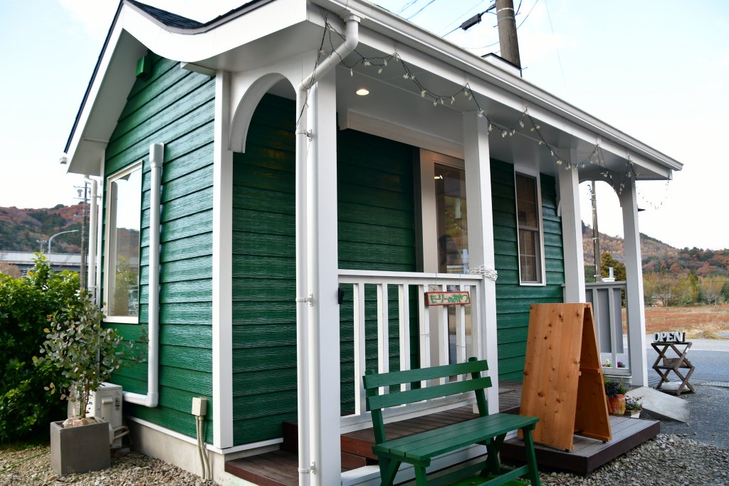 自然に囲まれた緑色の可愛いお店